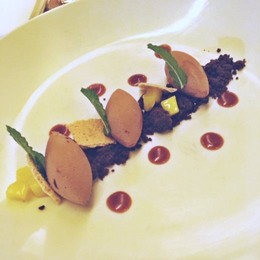 The duo of foie gras appetizer (entree’ in French) shows off a contrast of textures in the rich, herbed terrine and a silky, buttery parfait. Sliced pear adds the slightest hint of sweetness, to enhance the foie, not be cliche.