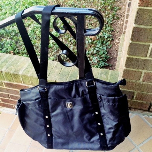 The “Have It All” may very well change your life. It’s a wide profile bag that has leather-look accents and floral metal studs that can look girly or rocker-chick, depending on how else you’re accessorized. The outside is completely wipeable, a smooth parachute-like material. Two outside deep pockets have adjustable stretch closures: perfect for sticking dirty shoes, water bottles or rolled up magazines.