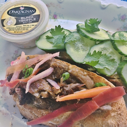I used it as part of my specially upgraded Banh Mi! I had some slices of homemade sourdough bread I have in the freezer. You’ve probably got some, too. I quick pickled some shavings of garden radishes that half-way grew for me, along with organic multi-colored carrots and jicama strips. Along with some cool slices of English cucumbers (which are less watery) and cilantro (it doesn’t taste like soap to me!), the shredded duck leg confit was just so delicious on it! There was a little shredding involved, but that’s not exactly molecular gastronomy or getting a brule’ torch out. You could make little Banh Mi sliders for a house gathering, serve with a cold IPA. You can do this!