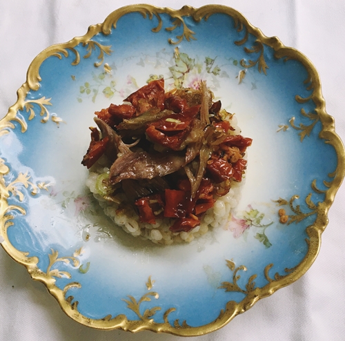 So, I grabbed half a bag of barley I had and cooked it in duck broth I made and froze at Passover. In a nice cast iron pan, I slowly heated up the duck leg confit. While that was going on, I soaked some sun-dried tomatoes in some warm water to plump them. You could substitute any dried fruit, even high quality raisins. When some of the duck fat was melting in the pan, I added some thinly sliced leeks and crisped them. You could substitute slow-roasted garlic, onions, any root veggies. Then, I shredded the duck leg confit. I mixed the duck, leeks and chopped sun-dried tomatoes. That’s it.