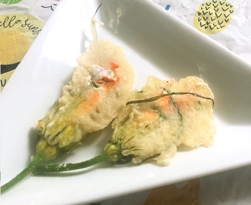 I learned from The Chef’s Garden suggestions a while back that squash blossoms are good stuffed with cheese, battered with flour and club soda, then quick-fried. I realized that I forgot to get club soda, so I looked up on the interwebs for a sub. Just like with subs for buttermilk, a little lemon in water did the trick. I also incorporated The Chef’s Garden micro herbs. This is super tasty: make more than you think you will need.