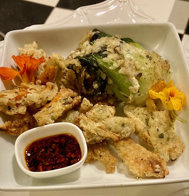 Okay, so maybe Cookie Monster would call this a “sometimes treat,” but it’s really good: tempura veggies! Carrots, butternut squash, potatoes and even bok choy make up this addictive snack. I put furikake in the batter.