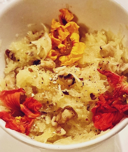 Spaghetti squash is well-known as a substitute for pasta in a side dish. I added butter, Parmesan cheese, toasted walnuts and edible flowers here. I also made brittle with the butternut squash and spaghetti squash seeds.