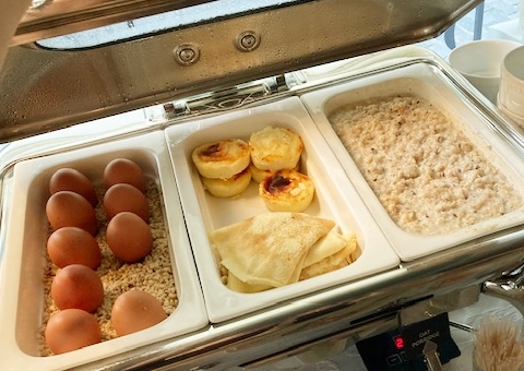 Once again, the “sausages” were hot dogs, but in this case, footlongs! Again, there was a hearty porridge. They make individual light egg souffle-like dishes.