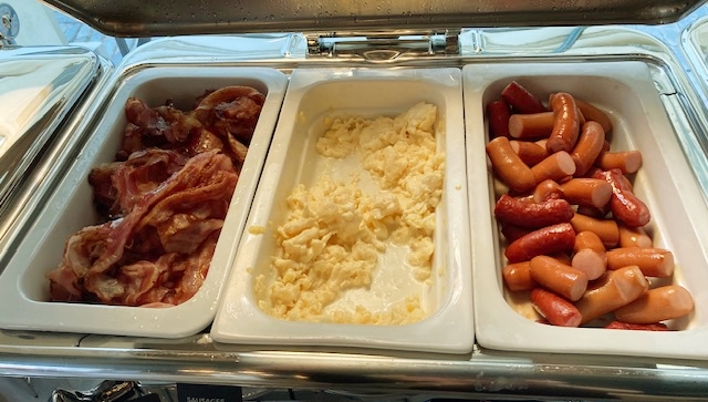 On their extensive breakfast buffet, they definitely have all the fixings for a traditional British “breakie” as they say: soft boiled eggs, roasted mushrooms, tomatoes, baked beans, “sausage” and bacon. I put sausage in quotes, because here and elsewhere, the Latvians consider hot dogs to be sausages!
