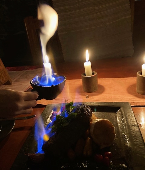 There are several game dishes on the menu, including rabbit and venison. Sensing that deer might be a “Latvian thing,” I ordered the red deer flambe’ with glazed mini carrots, made with rum. It’s flambeed table-side, so that was extra fun in the darkened room. I was told that the dish is symbolic of the summer solstice fests — a MAJOR deal in Latvia, it sounds like a national party — where they burn firewood. The deer was very tender and flavorful.