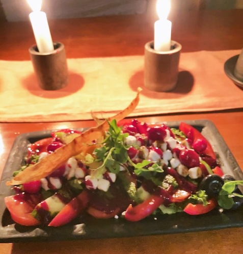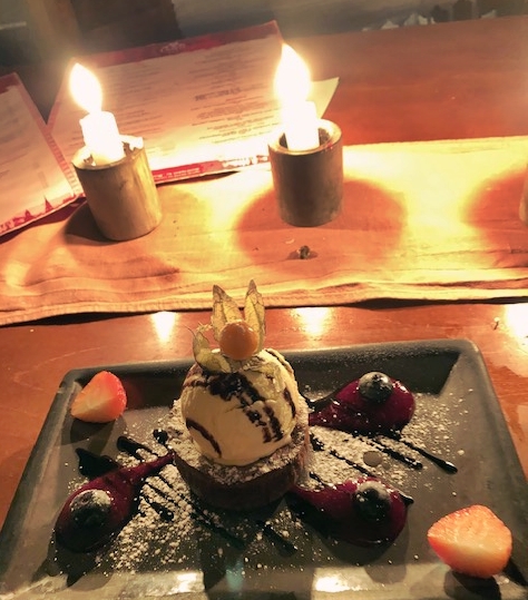 For dessert, I splurged (temptation got a hold of me!) and ordered chocolate souffle’ with caramel filling and ice cream, garnished with berry sauce and a sea buckthorn. It’s like cake meets gourmet candy!