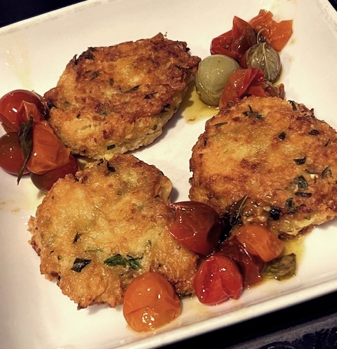 I blistered some tomatoes to accompany some cheesy eggy fritters that I created.