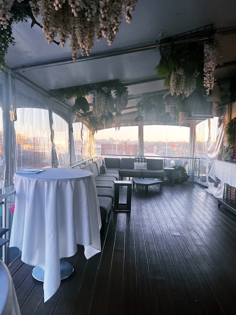Though it’s obviously open in warm weather, they zip it up in a sort of velcro clear tarp. The wind had been kicking up, so I took it upon myself to mush the velcros together that had split apart. The place is like patio meets chic European garden.