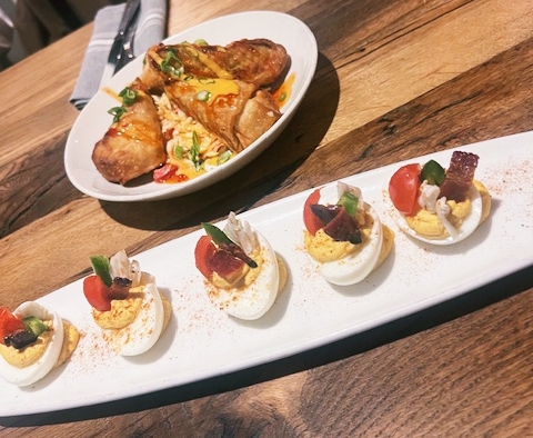 Deviled Eggs are not too salty, with a rich, creamy flavor enhanced by smoky bacon. The presentation is cool bistro, not crab shack bench.